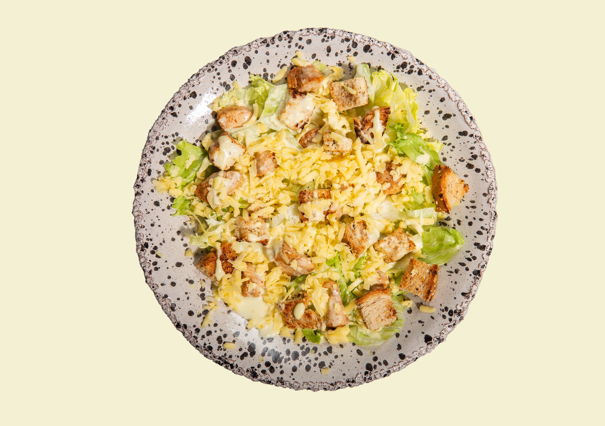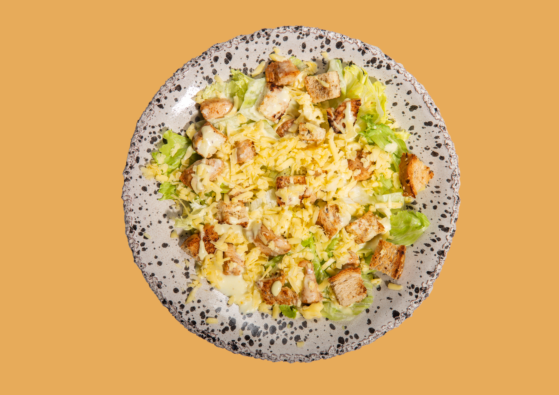 Grilled chicken breast, Iceberg Lettuce, Shredded cheddar Cheese, Roasted Toast. Comes with Chopped's Ceasar sauce!