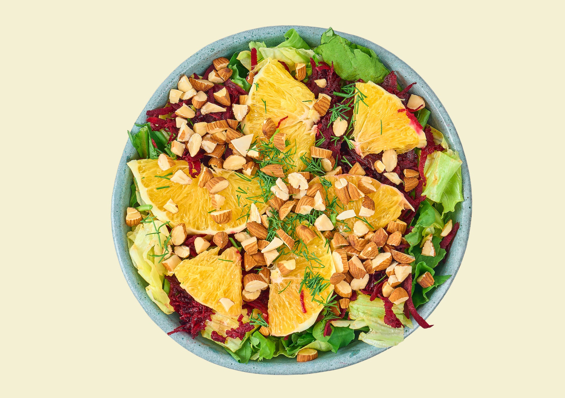 Orange, Beetroot, Iceberg lettuce, Rocca Leaves, Cilantro, Crushed Almonds.